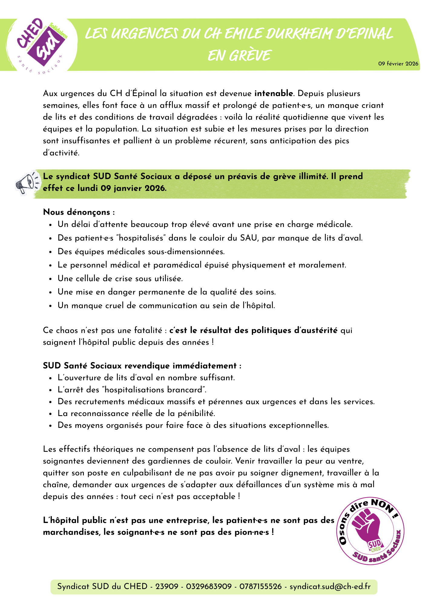 Aux urgences du CH d’Épinal la situation est devenue intenable. Depuis plusieurs semaines, elles font face à un afflux massif et prolongé de patient·e·s, un manque criant de lits et des conditions de travail dégradées : voilà la réalité quotidienne que vivent les équipes et la population. La situation est subie et les mesures prises par la direction sont insuffisantes et pallient à un problème récurent, sans anticipation des pics d’activité.